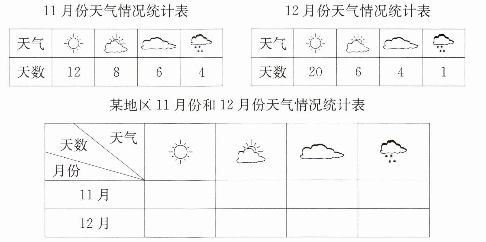 三、下面是某地区11月份和12月份天气情况统计表。请你将两个统计表合并成一个复式统计表,并回答问题。