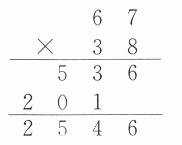 分析 先用第二个乘数个位上的8去乘67,按两位数乘一位数笔算的方法去乘,乘得的积的末位和38的个位对齐。再用第二个乘数十位上的3去乘67,乘得的积的末位和38的十位对齐,哪一位上的乘积满几十,就向前一位进几,计算时不要忘记加进位的数,最后把两次乘得的积相加。