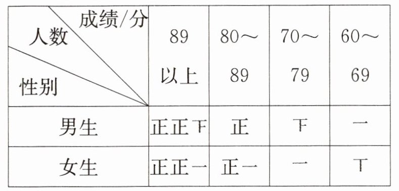 分析 可以先用画“正”字的方法整理出男、女生各分数段的人数,这样可以避免遗漏或重复,统计后把男、女生各分数段的人数加起来,看是否与所给数据的个数相等。
