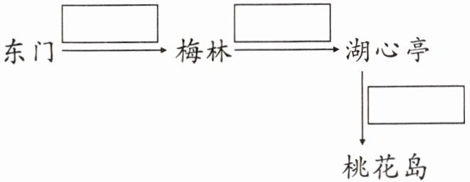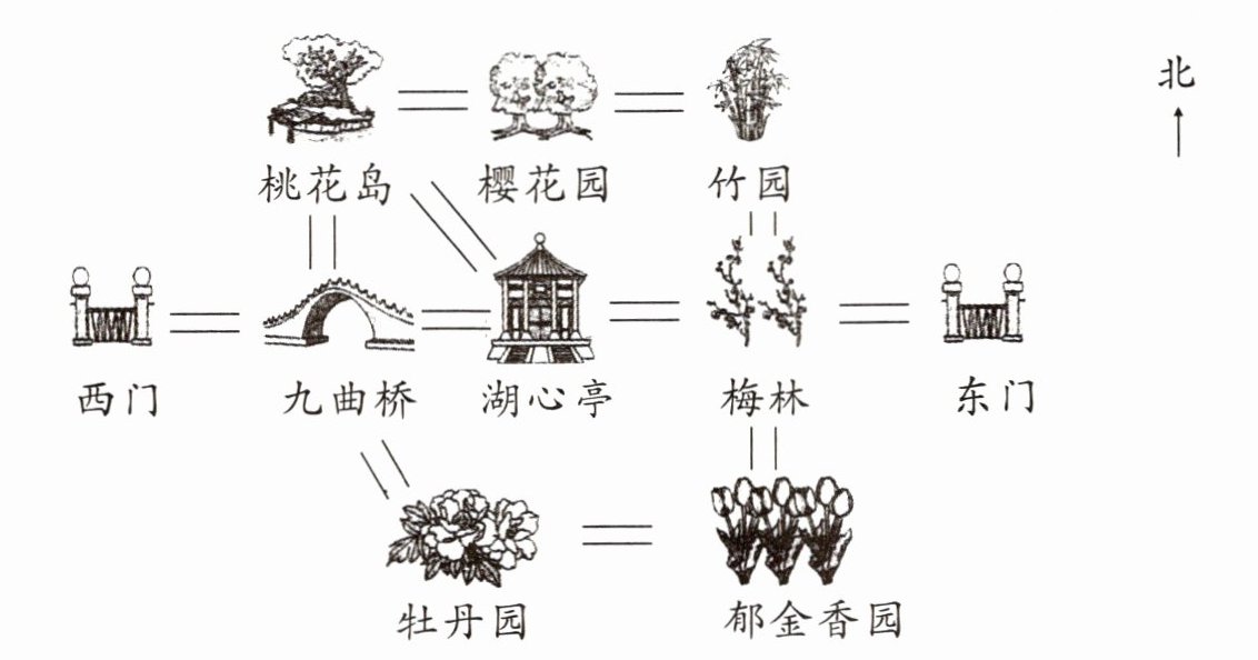 (2)从西门出发,向东走到九曲桥,再向东走到湖心亭,接着向东走到梅林,最后向南走到郁金香园。