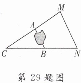 29. 如图,$A$,$B$两点被池塘隔开,不能直接测量其距离。于是,小明在岸边选一点$C$,连接$CA$,$CB$,分别延长到点$M$,$N$,使$AM = AC$,$BN = BC$,测得$MN = 200m$,则$A$,$B$间的距离为______