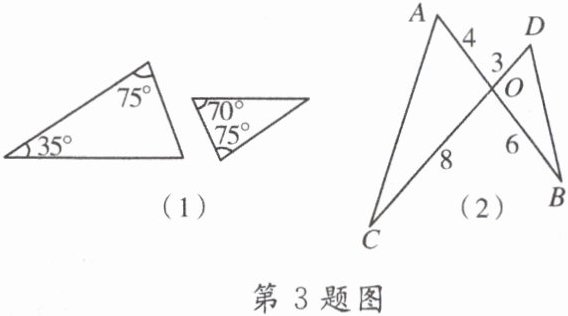 3. 如图小明在作业纸上画出(1)、(2)两组三角形,每组各有两个三角形,其边长和角的度数已在图上标注,对于图(1)、(2)中的两个三角形而言,下列说法正确的是( )