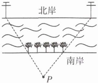 8. 如图,一条河的两岸有一段是平行的,在河的南岸边每隔$5$米有一棵树,在北岸边每隔$50$米有一根电线杆。小丽站在离南岸边$15米的点P$处看北岸,发现北岸相邻的两根电线杆恰好被南岸的两棵树遮住,并且在这两棵树之间还有三棵树,则河宽为