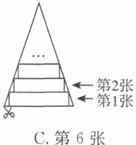 C [解析]根据相似三角形的相似比求得顶点到这个正方形上面边的距离,再根据矩形的宽求得是第几张.已知剪得的纸条中有一张是正方形,则正方形中平行于底边的长是3,所以根据相似三角形的性质可设从顶点到这个正方形的上面边的距离为x,则$\frac{3}{15}$=$\frac{x}{22.5}$,解得x=4.5,所以另一段长为22.5−4.5=18,因为18÷3=6,所以是第六张.故选C.