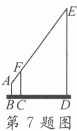 7. 如图,某测量工作人员站在地面点 $B$ 处利用标杆 $FC$ 测量一旗杆 $ED$ 的高度. 测量人员眼睛处点 $A$ 与标杆顶端处点 $F$,旗杆顶端处点 $E$ 在同一直线上,点 $B$,$C$,$D$ 也在同一条直线上. 已知此人眼睛到地面距离 $AB = 1.6$ 米,标杆高 $FC = 3.2$ 米,且 $BC = 1$ 米,$CD = 5$ 米,则旗杆的高度为( )