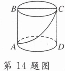 14. 如图,一圆柱体的底面周长为$24cm$,高$AB为9cm$,$BC$是上底面的直径.一只蚂蚁从点$A$出发,沿着圆柱的侧面爬行到点$C$,则蚂蚁爬行的最短路程是______$cm$.