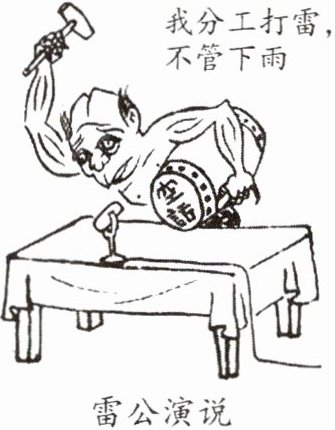 (3)示例:雷公在发表演讲,他一手举着锤子,一手抱着腰鼓,说:“我分工打雷,不管下雨。”寓意:主要讽刺了一些人不懂得空谈误国、实干兴邦,不懂得实际行动比说空话更重要的道理。