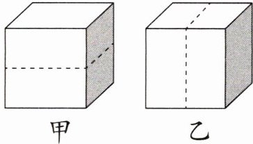 1500 不变【解析】棱长为 $ 10 \, \text{cm} $ 的正方体放在水平桌面上,切去前,桌面的受力面积为 $ S = 10 \, \text{cm} × 10 \, \text{cm} = 100 \, \text{cm}^{2} = 0.01 \, \text{m}^{2} $,正方体对桌面的压力为 $ F = G = mg = 3 \, \text{kg} × 10 \, \text{N/kg} = 30 \, \text{N} $,正方体对桌面的压强为 $ p = \frac{F}{S} = \frac{30 \, \text{N}}{0.01 \, \text{m}^{2}} = 3000 \, \text{Pa} $。若沿如图甲所示的虚线去掉一半后,桌面的受力面积不变,压力减小为原来的一半,由 $ p = \frac{F}{S} $ 可知,剩余部分对桌面的压强变为原来压强的一半,即剩余部分对桌面的压强为 $ p_{\text{甲}} = \frac{1}{2}p = \frac{1}{2} × 3000 \, \text{Pa} = 1500 \, \text{Pa} $。如果沿如图乙所示的虚线去掉一半,其余部分不动,桌面的受力面积变为原来的一半,剩余部分对桌面的压力也变为原来的一半,由 $ p = \frac{F}{S} $ 可知,剩余部分对桌面的压强与原来的压强相等。