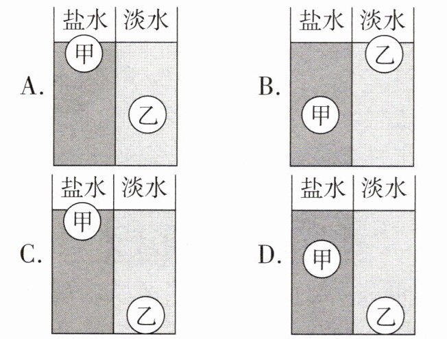 7. 隔板从中间将容器隔开,两边分别装有盐水、淡水($ρ_{盐水}>ρ_{淡水}$),甲、乙两实心球体积相同,若甲、乙所受的重力和排开液体所受的重力如表,则两球静止在液体中时的情形可能是(