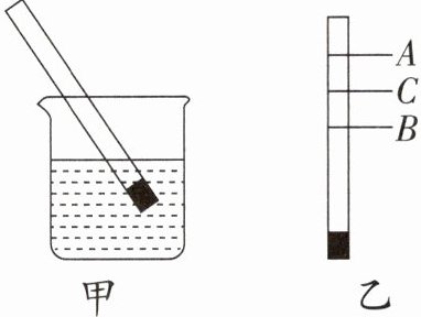 (选填“增加”或“减少”)铜丝的量。调整并标好刻度后如图乙所示,A处示数为$1g/cm^{3}$,B处为$1.8g/cm^{3}$。把它放入某液体中,液面恰好处在AB的中点C处,则所测液体的密度小于