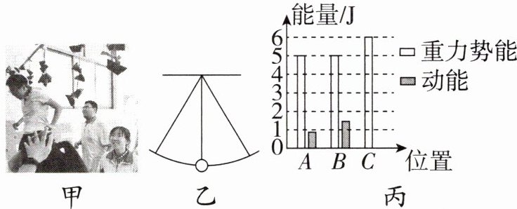 5. 新素材〔链接生活〕端午之际,学校走廊挂上了粽子,同学们跳一跳、顶一顶,寓意“一顶高粽(一定高中)”,如图甲所示。某粽子在空中运动轨迹的简化图如图乙所示,粽子经过$A$、$B$、$C$三点的能量如图丙所示,下列说法可能正确的是(