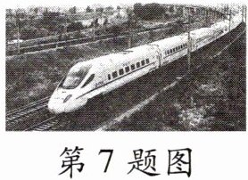 7. 如图所示,总质量为$3.5×10^{5}kg$的列车在水平直轨道上以最大速度360km/h匀速行驶时,所受的阻力为车重的0.04倍。此时列车牵引力的总功率为(