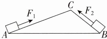 4. 如图所示,$AC>BC$,把同一物体分别沿斜面$AC$、$BC$推上顶端,推力分别为$F_{1}$、$F_{2}$,所做的功分别为$W_{1}$、$W_{2}$。在不考虑摩擦的情况下(