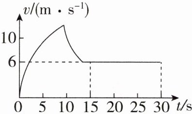 由图像可知,$15 \, \text{s}$ 后运动员以 $v = 6 \, \text{m/s}$ 的速度做匀速直线运动,运动时间 $t_{\text{后}} = 30 \, \text{s} - 15 \, \text{s} = 15 \, \text{s}$