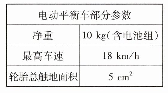17. (10分)大亮买了一辆电动平衡车,如图所示,平衡车部分参数如下表。他从家骑该电动平衡车以1km/h的速度匀速行驶,用15min到达了市民广场。大亮的质量为70kg,$g$取10N/kg,求: