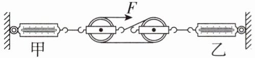 A [解析]由图知,滑轮组承担左边拉力的绳子股数n = 3,不计滑轮、弹簧测力计及轻绳的质量,拉力F = $\frac{1}{3}$F左,滑轮组受到水平向左的拉力F左 = 3F = 3×4N = 12N,根据力的作用是相互的可知,甲弹簧测力计的读数为12N;滑轮组承担右边拉力的绳子股数n = 2,不计滑轮、弹簧测力计及轻绳的质量,拉力F = $\frac{1}{2}$F右,滑轮组受到水平向右的拉力F右 = 2F = 2×4N = 8N,根据力的作用是相互的可知,乙弹簧测力计的读数为8N。故选A。
