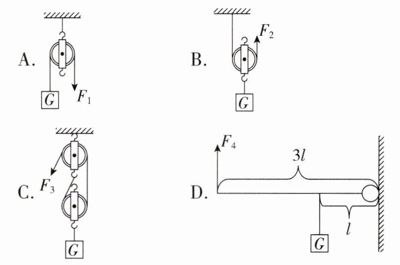 2. 在工地上,工人们需要提升一块重物到高处,其中最省力的装置是(忽略绳重、滑轮重和摩擦)(