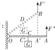 杠杆在B位置,OA'为动力臂,OC'为阻力臂,阻力不变为G,OC':OA' = OD:OB = 1:2;杠杆平衡,由杠杆平衡条件,得F'lOA' = GlOC',则F' = $\frac{G×lOC'}{lOA'}$ = $\frac{1}{2}$G = $\frac{1}{2}$×100N = 50N;由此可知,当杠杆从A位置匀速提升到B位置的过程中,力F的大小不变。