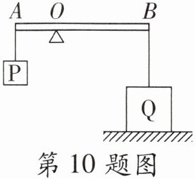 10. 如图所示,现将重为800N的物体Q挂在杠杆的B端,在A端悬挂一个重为200N的物体P,使杠杆在水平位置平衡,忽略杠杆自重的影响,若$OA:AB = 4:9$,那么物体Q对杠杆的拉力是
