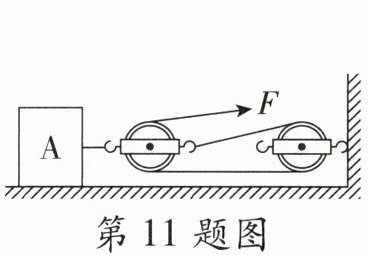 11. 如图所示的滑轮组沿水平方向匀速拉动物体A,已知物体A的质量$m = 225kg$,绳自由端拉力$F = 250N$,物体A与地面间的滑动摩擦力是物体A重力的0.2倍,该滑轮组的机械效率是