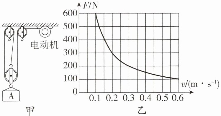 8. 建筑工地用如图甲所示的装置提升重物A,电动机拉动绳子的功率保持不变,电动机对绳子的拉力F与绳子自由端的移动速度v的关系如图乙所示。重物A以0.1m/s的速度匀速上升时,滑轮组的机械效率为80%,不计绳重与摩擦。下列分析与计算正确的是(
