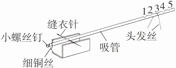 7. 新考法〔创新性实验〕某兴趣小组制作了如图所示的能测一根头发丝质量的“小天平”,取一根细长的饮料吸管,在其靠左端朝上剪一个小缺口,靠右端朝上剪出多个小缺口,然后在距左端一定距离处穿过一缝衣针,并在左端插入一个小螺丝钉,将吸管放在支架上。仔细调节小螺丝钉的位置,使吸管在支架上保持水平平衡,测量时在左端缺口处挂一段质量已知的细铜丝,右端缺口处放上一根头发丝。关于测量原理和方法,说法正确的是(