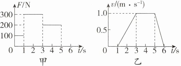200 400【解析】由图乙可知,在1~3s内箱子做加速运动,在5~6s内箱子做减速运动,只有在3~5s内箱子做匀速运动,处于平衡状态;由平衡条件可知,箱子受到的滑动摩擦力$f=F=200N$;由于压力和接触面的粗糙程度均不变,则滑动摩擦力不变,故箱子在第2s时受到的摩擦力为200N。由图乙可知,在3~5s内箱子的运动速度$v=1.0m/s$,推力$F=200N$,在3~5s内移动的距离为$s=vt=1.0m/s×2s=2m$;所以箱子在3~5s内推力做功$W=Fs=200N×2m=400J$。