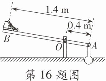 16. 如图所示是农村舂米工具的示意图,O为固定转轴,A处连着石球(石球固定不动),石球重50N,不计摩擦和杆重,当脚沿垂直于杆的方向用力$F_1,$缓慢将石球抬起时$,F_1$的力臂为