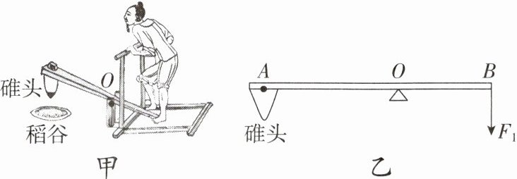 9. 如图甲所示是《天工开物》里记载的一种捣谷的舂,其简化原理图如图乙所示,已知AO>OB,捣谷人对B点的作用力$F_1$使水平静止的横木转动。不计横木的重力和转动摩擦,下列说法正确的是(