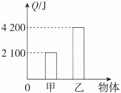 11. B 【解析】AB. 甲的比热容为 $ c_{甲} = \frac{Q_{甲}}{m_{甲} \Delta t_{甲}} = \frac{2100 J}{1 kg × 1 ^ { \circ } C } = 2100 J/(kg \cdot ^ { \circ } C) $,乙的比热容为 $ c_{乙} = \frac{Q_{乙}}{m_{乙} \Delta t_{乙}} = \frac{4200 J}{1 kg × 1 ^ { \circ } C } = 4200 J/(kg \cdot ^ { \circ } C) $,甲、乙的比热容之比为 $ 1 : 2 $,由于 $ c_{水} > c_{液体} $,所以乙为水,故 A 错误,B 正确;C. 由 $ Q = cm \Delta t $ 知甲、乙质量相同,放出热量相同,甲的比热容小,