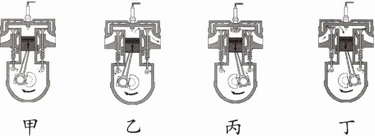 【解析】:根据热机工作过程的特点,甲图中两气门都关闭,活塞向上运动,气缸容积减小,是压缩冲程;乙图中排气门打开,活塞向上运动,气缸容积减小,是排气冲程,此过程中没有发生能量转化;丙图中两气门都关闭,活塞向下运动,气缸容积增大,是做功冲程;丁图中进气门打开,活塞向下运动,气缸容积增大,是吸气冲程。逐一分析选项,A选项丙冲程是做功冲程不是吸气冲程;B选项甲冲程是压缩冲程,该选项正确;C选项乙冲程是排气冲程,没有把内能转化为机械能;D选项丁冲程是吸气冲程不是排气冲程。