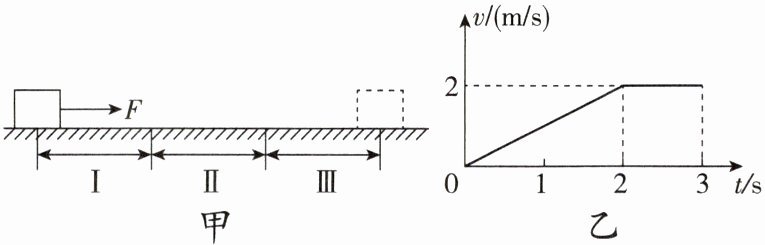 7. D 【解析】由图知,物块在 $0\sim2$ s 内做加速运动,在 $2\sim3$ s 内做匀速运动,且物块在 $0\sim2$ s 内图像与 $2\sim3$ s 内图像与坐标轴围成的面积相同,说明物块运动的路程相同。即物块在 $0\sim2$ s 内在区域Ⅰ上做加速运动,在 $2\sim3$ s 内在区域Ⅱ上做匀速直线运动,区域Ⅰ表面上受到的摩擦力小于拉力 $F$,在区域Ⅱ表面上受到的摩擦力等于拉力 $F$。A. 由图乙知,物块在 $0\sim2$ s 内在区域Ⅰ上做加速运动,故 A 正确; B. 物块进入区域Ⅲ时的速度为 $2$ m/s,做减速运动,在区域Ⅲ的平均速度一定小于 $2$ m/s,所以运动时间一定大于 $1$ s,故 B 正确; C. 在 $2\sim3$ s 内在区域Ⅱ上做匀速直线运动,受到的摩擦力与拉力是一对平衡力,大小相等,所以区域Ⅱ表面上受到的摩擦力等于拉力 $F$,等于 $2$ N,故 C 正确; D. 由图乙知:物块在区域Ⅰ和Ⅱ上所用的时间不相等,故 D 错误。故选 D。