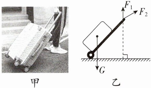 8. 图甲中的同学拉着行李箱健步行走在水平路面上,行李箱匀速前进并保持倾角不变。假如这一过程中行李箱(含箱内物体)受到的重力G如图乙所示,则该同学对行李箱施加的拉力有没有可能是图乙中的$F_{1}$、$F_{2}$?你的判断是(