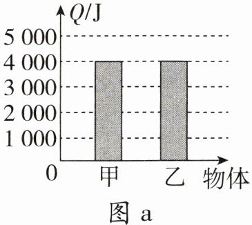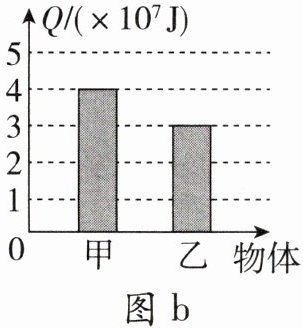 C 【解析】A. 由图a知,甲、乙升高相同的温度,吸收相同的热量, $ m_{甲} = 2m_{乙} $,由 $ c = \frac{Q_{吸}}{mΔt} $ 可知, $ c_{甲} = \frac{1}{2}c_{乙} $,即:甲的比热容小于乙的比热容,故A错误;B. $ m_{甲} = 2m_{乙} $,完全燃烧后甲、乙放出的热量之比 $ Q_{甲}:Q_{乙} = (4×10^{7}J):(3×10^{7}J) = 4:3 $,由 $ q = \frac{Q_{放}}{m} $ 可知, $ q_{甲}:q_{乙} = \frac{Q_{甲}}{m_{甲}}:\frac{Q_{乙}}{m_{乙}} = \frac{4}{2}:\frac{3}{1} = 2:3 $,即:甲的热值小于乙的热值,故B错误;C. $ c_{甲} = \frac{1}{2}c_{乙} $, $ m_{甲} = 2m_{乙} $,都降低 $ 1^{\circ}C $,由 $ Q_{放} = cmΔt $ 可知,放出的热量相等,故C正确;D. 甲的热值小于乙的热值,由 $ Q_{放} = mq $ 可知,相同质量的甲、乙燃料完全燃烧放出的热量 $ Q_{甲} < Q_{乙} $,故D错误。故选C。