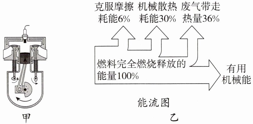 7. 教改题汽车是现代生活中最常见的一种交通工具,如图甲、乙分别是某汽油机的某冲程及能量流向图。下列有关说法正确的是 (