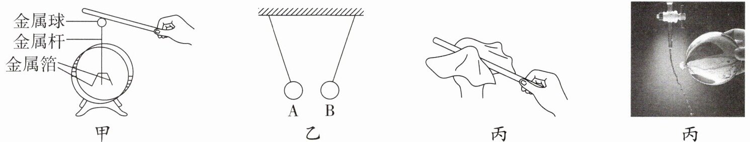 C.图丙,玻璃棒与丝绸摩擦后带正电荷,是因为在摩擦过程中玻璃棒得到电子
