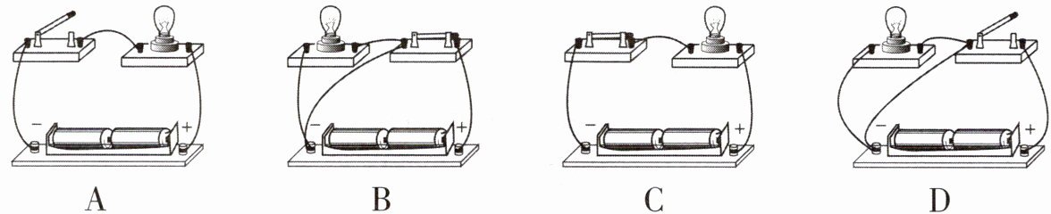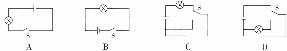 【解析】:通路是处处连通的电路,电路中有电流,灯泡能够发光,C图中开关闭合后,电流从电源正极出发经过灯泡、开关回到电源负极,灯泡能发光,所以C图灯泡处于通路状态;断路是电路某处断开,电路中没有电流,灯泡不发光,A图中开关是断开的,D图中开关也是断开的,所以A、D图处于断路状态;短路是电源两极不经过用电器直接连通的电路,B图中开关闭合后,电流不经过灯泡,直接从电源正极经过开关回到电源负极,灯泡被短路,所以B图灯泡处于短路状态。