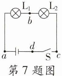 7. 如图所示,闭合开关S时,灯泡$L_1、$$L_2$都不亮。用一段导线的两端接触a、b两点时,灯$L_1$不亮$,L_2$亮;接触b、c两点时,两灯都不亮;接触c、d两点时,两灯也不亮,则下列判断正确的是 (