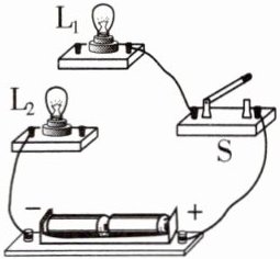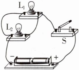 解析:$L_1$与$L_2$两灯并联,开关S控制两盏灯,开关接在干路上,注意灯和电源不能短路。