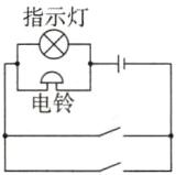 14. 公交车后门的两个扶杆上通常各装有一个按钮,每一个按钮都是一个开关,当乘客按下任何一个按钮时,驾驶台上的指示灯发光,同时电铃响,提醒司机有人要下车,指示灯或电铃其中一个坏了不会影响另外一个工作。请在框中设计符合要求的电路图。