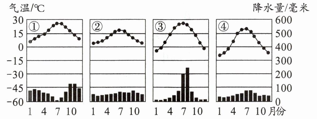 ①热带气候 ②亚热带季风气候 ③温带季风气候 ④寒带气候