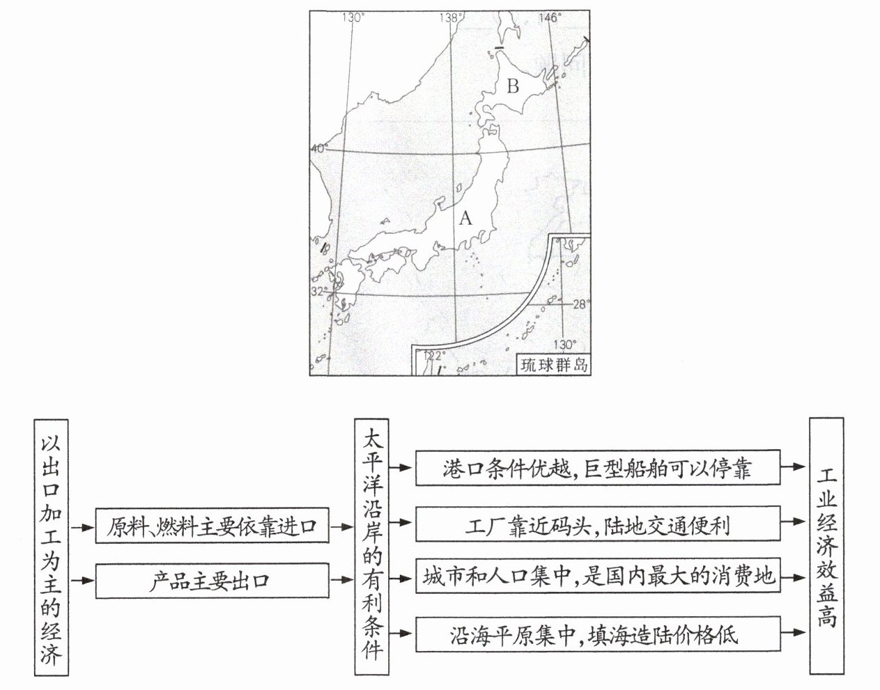 5. 太平洋沿岸;濑户内海;因素:日本原料、燃料主要依靠进口,产品主要出口;太平洋沿岸和濑户内海沿岸港口条件优越,巨型船舶可以停靠;工厂靠近码头,陆地交通便利;城市和人口集中,是国内最大的消费地;沿海平原集中,填海造陆价格低。