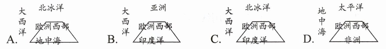 8. 学习地理要学会做地图笔记,如图所示某班同学学习了“欧洲西部的地理位置”后所做的四份地图笔记,正确的是(