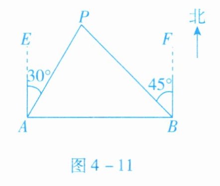 2. 如图4-11所示,$A$,$B$两座城市相距100km,现计划要在两座城市之间修筑一条高速公路(即线段$AB$). 经测量,森林保护区中心点$P在A城市的北偏东30^{\circ}$方向,$B城市的北偏西45^{\circ}$方向上. 已知森林保护区的范围在以$P$为圆心,50km为半径的圆形区域内. 请问:计划修筑的这条高速公路会不会穿过森林保护区?为什么?