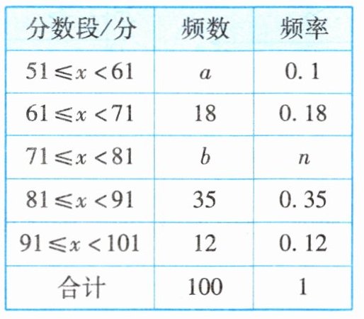 - 根据频数$=$总数$×$频率,已知总数为$100$,$51\leqslant x\lt61$分数段的频率是$0.1$,则$a = 100×0.1=10$。