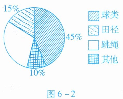 4. 某校为了解学生喜欢的体育活动项目,随机抽查了$100$名学生,让每人选一项自己喜欢的项目,并制成如图$6 - 2$所示的扇形统计图. 如果该校有$1200$名学生,则喜欢跳绳的学生约有