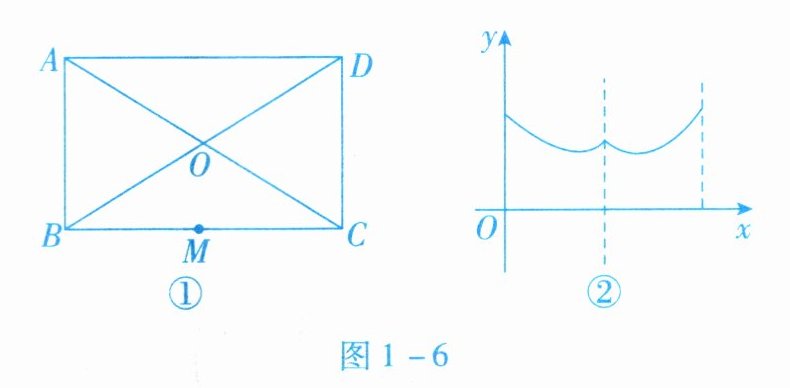 5. 一个寻宝游戏通道如图$1-6$①所示,通道在同一平面内由$AB$,$BC$,$CD$,$DA$,$AC$,$BD$组成. 定位仪器放置在$BC的中点M$处,设寻宝者行进的时间为$x$,寻宝者与定位仪器之间的距离为$y$,寻宝者匀速前进,$y与x之间的函数关系图象如图1-6$②所示,则寻宝者的行进路线可能是(