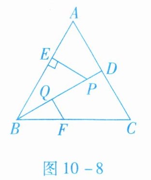 1. 如图$10 - 8$所示,$\triangle A B C$是等边三角形,$P是\angle A B C的平分线BD$上一点,$P E \perp A B于点E$,线段$BP的垂直平分线交BC于点F$,垂足为点$Q$.若$B F = 2$,则$PE$的长为(