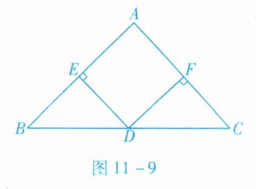 2. 如图 11 - 9 所示,在$△ABC$中,$∠B= ∠C$,$D 是 BC $的中点,$DE⊥AB$,$DF⊥AC$,垂足分别为$ E$,$F$. 求证: