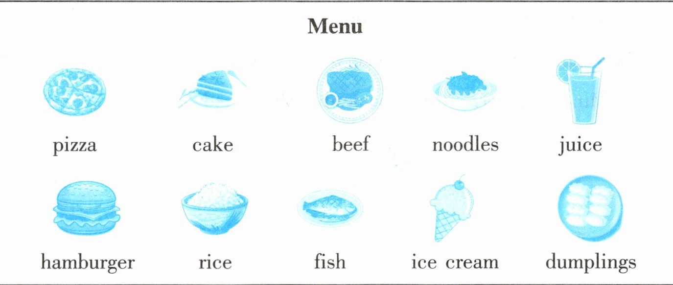 B: Well, we have pizza, hamburger, beef, fish, noodles, rice, dumplings and so on. And we also have juice and ice - cream.